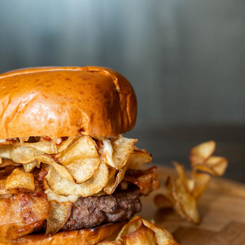 Potato chips, crisp bacon, Swiss & cheddar, fried egg and pickle with ketchup and mayo.