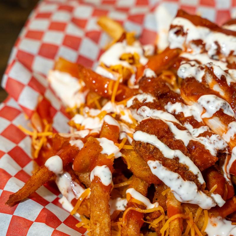 Crispy fries tossed in Cajun seasoning, crispy chicken breast with shredded cheddar cheese and Ranch dressing, and buffalo sauce on top.