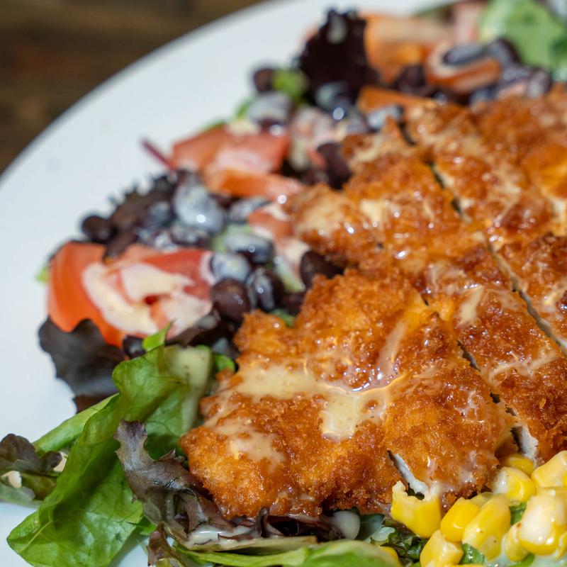 Crispy chicken breast with corn, black beans, red onions, and honey mustard dressing.