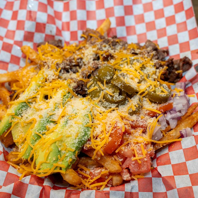 Crispy fries with marinated in Korean BBQ sauce sliced rib eye, shredded cheddar cheese, chopped tomato, onion, jalapeno, avocado, and parmesan cheese on top.